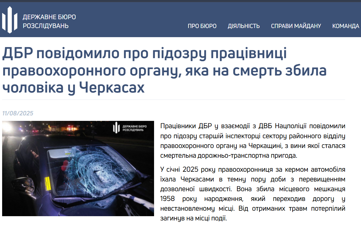 "Співробітники ДБР у взаємодії з ДВБ Нацполіції повідомили про підозру старшій інспекторці сектору районного відділу правоохоронного органу Черкаської області, з вини якої сталася смертельна дорожньо-транспортна пригода", - йдеться у повідомленні.