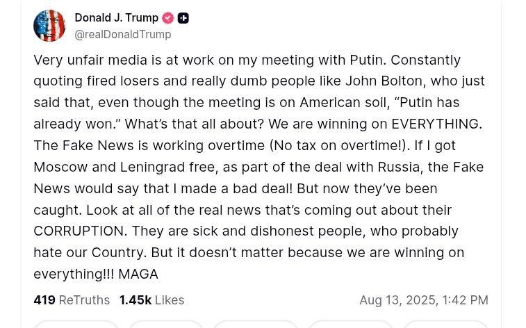 "Дуже несправедлива робота ЗМІ з приводу моєї зустрічі з Путіним. Постійно цитують звільнених невдах і справді дурних людей на кшталт Джона Болтона, який щойно сказав, що, навіть незважаючи на те, що зустріч проходить на американській землі, "Путін уже переміг". Що це взагалі означає? Ми перемагаємо у ВСЬОМУ. Фейкові новини працюють у понаднормовому режимі (податку на понаднормові немає!). Якби я отримав Москву та Ленінград безкоштовно у рамках угоди з Росією, фейкові новини сказали б, що я уклав погану угоду! Але тепер їх упіймали. Подивіться на всі справжні новини, які виходять про їхню корупцію. Це хворі та нечесні люди, які, ймовірно, ненавидять нашу країну. Але це не має значення, тому що ми перемагаємо у всьому!" – написав президент США.