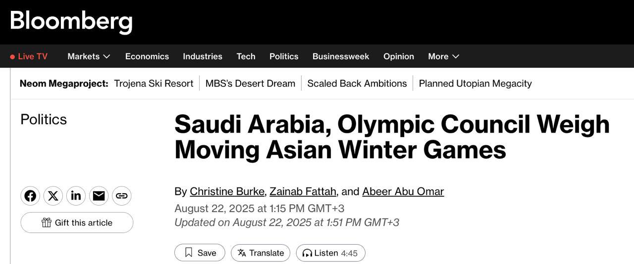 Саудівська Аравія не справляється із завданням створити сніг, а тому просить Китай взяти на себе проведення Азіатських зимових ігор 2029 року, повідомляє Bloomberg.