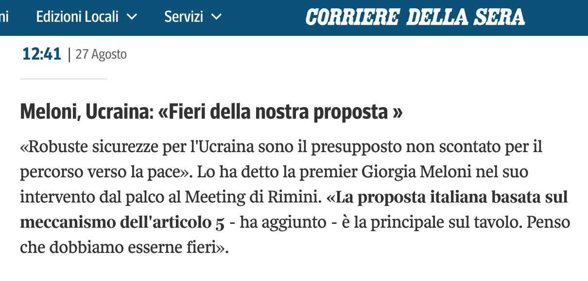 "Прем'єр Італії запропонувала надати Україні гарантії на основі статті 5 про колективну оборону НАТО, але без фактичного членства в альянсі. Це один з варіантів, які опрацьовуються європейськими лідерами. Пропозиція Мелоні підтверджує, що вступ України до НАТО не розглядається, але пропонує механізм колективної допомоги як найбільш оптимальний варіант. 5 він зобов'яже країни, які підписали двосторонні угоди з Україною, швидко домовитися про відповідь у разі нападу", - коментує Bloomberg.