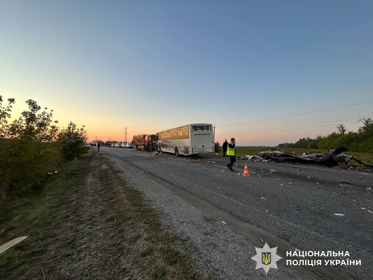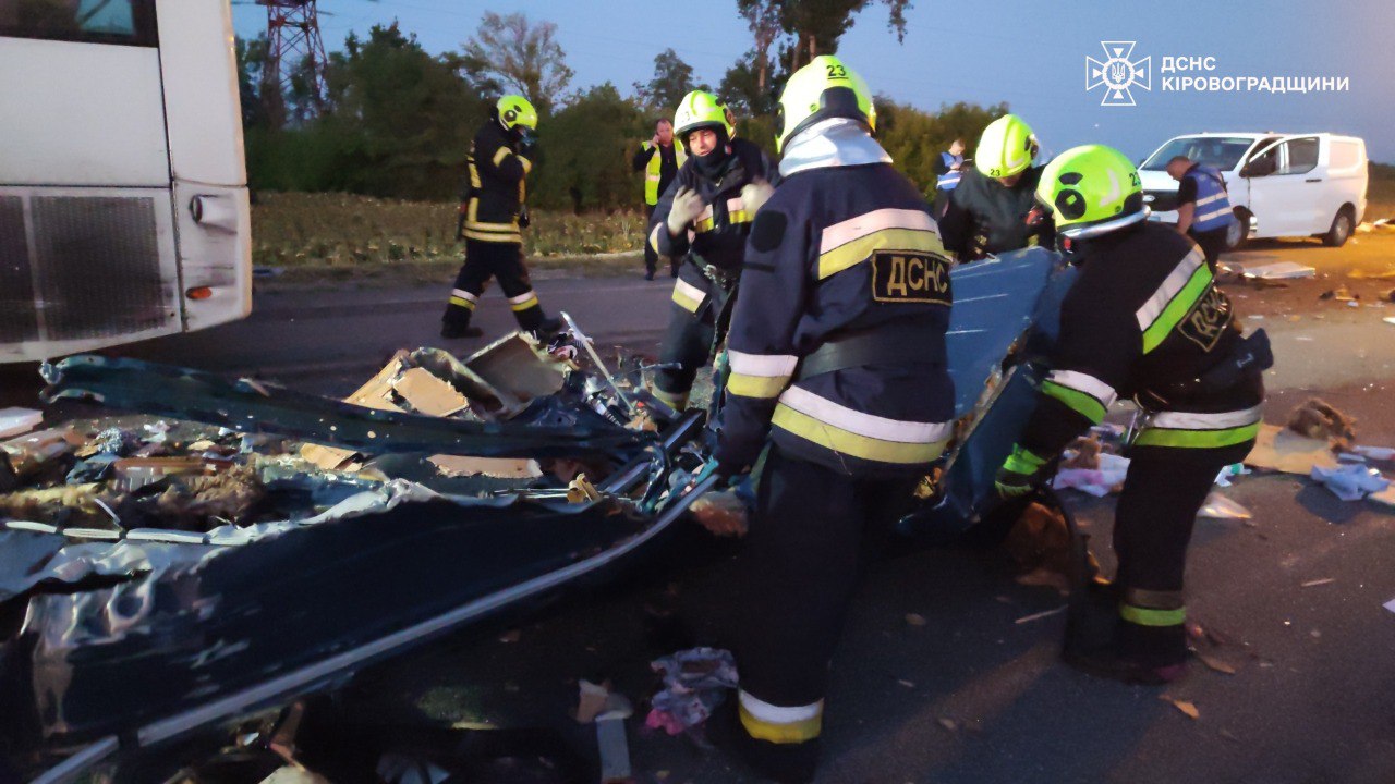 Смертельна ДТП за участю автобуса MAN та мікроавтобуса Mercedes-Benz Sprinter сталася біля села Хмелеве Новоукраїнського району Кіровоградської області. Загинуло шестеро людей, серед них дитина. Ще 6 – травмовано, їх госпіталізували до лікарні.