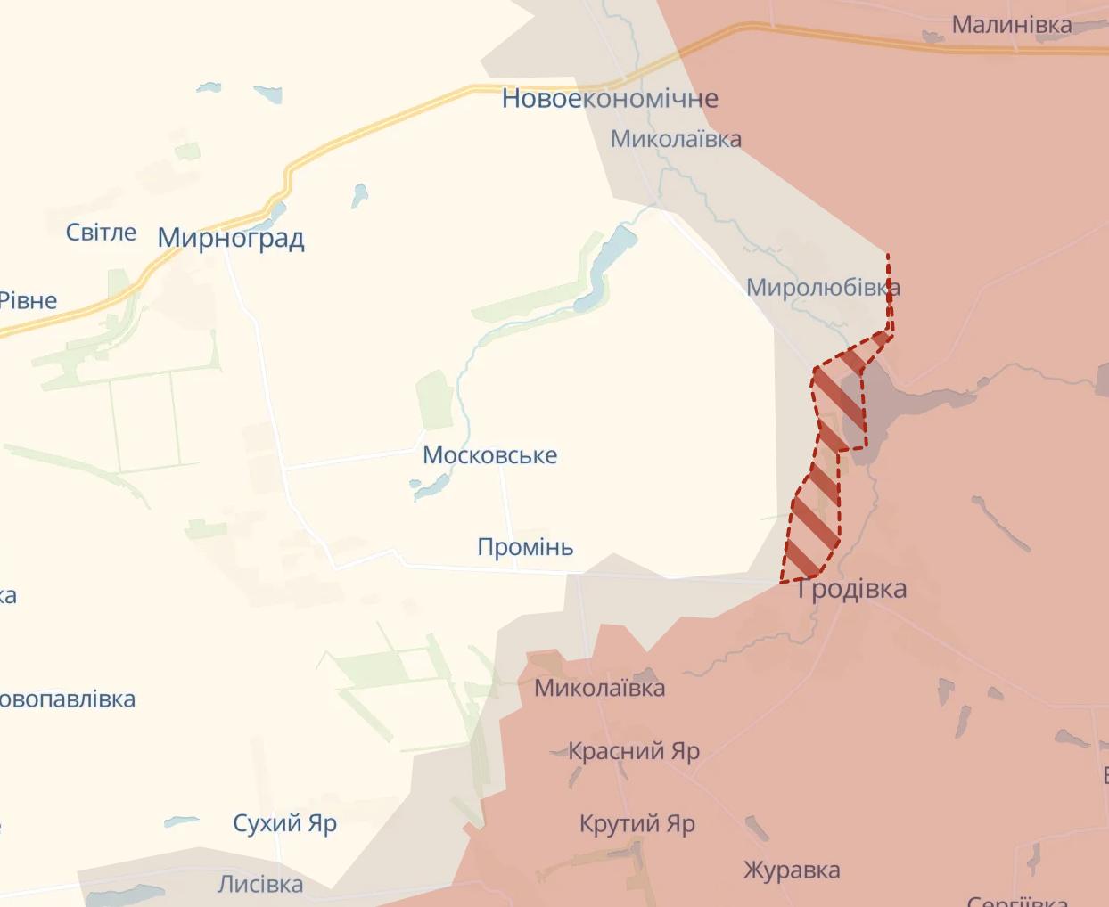 Російські ж війська просунулися на південь від Новоселівки - поблизу Камишевахи Донецької області. Також просування зафіксовано на схід від Мирнограда по лінії Гродівка-Миролюбівка.