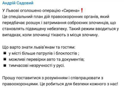 Мер міста Андрій Садовий заявив, що під час операції "Сірена" у Львові зупиняють автомобілі для огляду та перевірки документів. У місті продовжує діяти план "перехоплення" через вбивство Парубія.