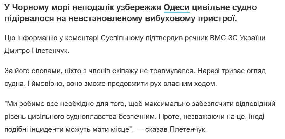 У коментарі "Супільному" спікер ВМФ Дмитро Плетенчук заявив, що в результаті вибуху потерпілих немає, а зараз триває огляд судна, яке, за його словами, можливо, продовжить плавання.