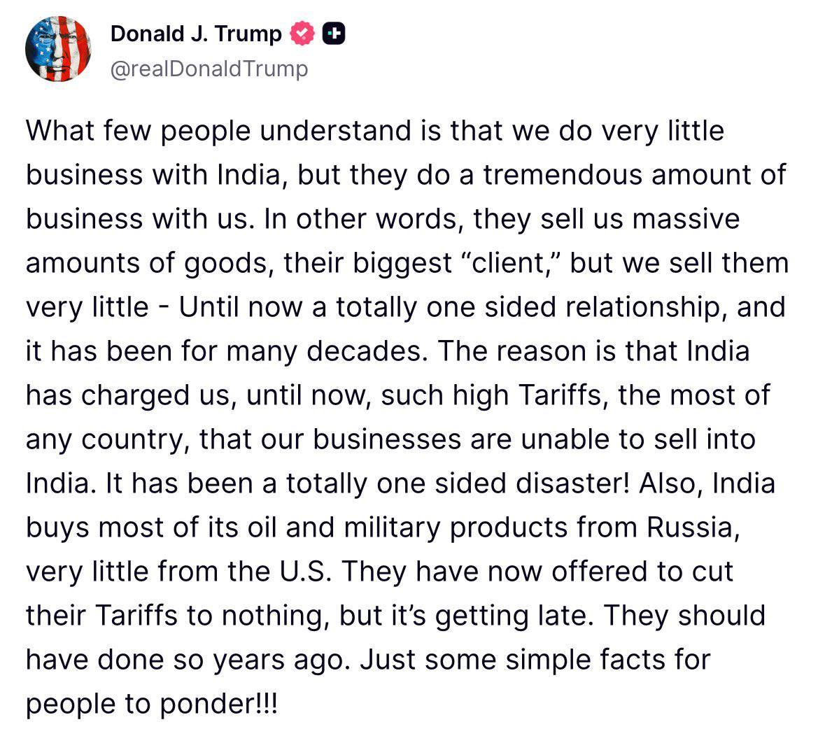"Крім того, Індія купує більшу частину своєї нафти та військової продукції у Росії, майже нічого у США. Зараз вони запропонували повністю скасувати мита, але вже пізно - це слід було зробити багато років тому. Просто деякі прості факти для роздумів!" – написав Трамп.