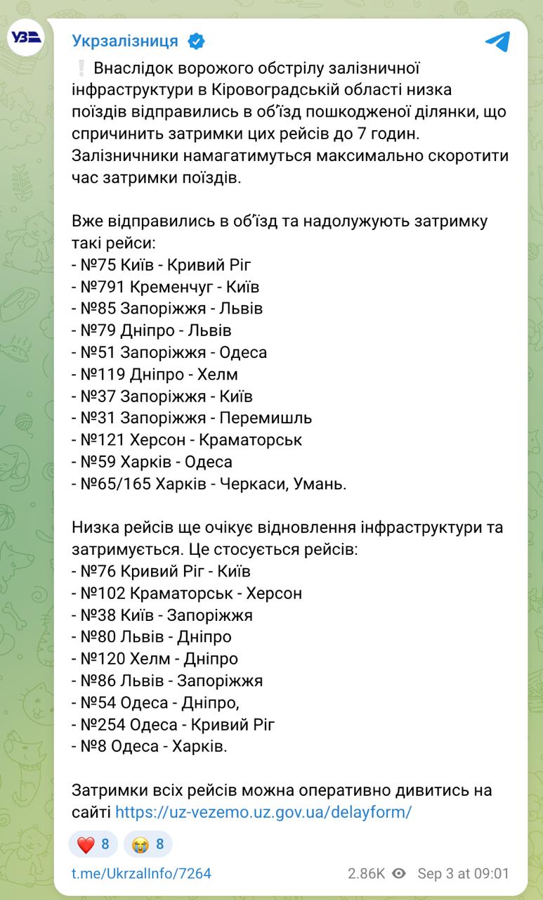 Крім того, в Україні через нічну атаку затримується безліч поїздів, повідомляє компанія "Укрзалізниця" та публікує відповідний графік. Додається, що затримки становлять понад 7 годин.