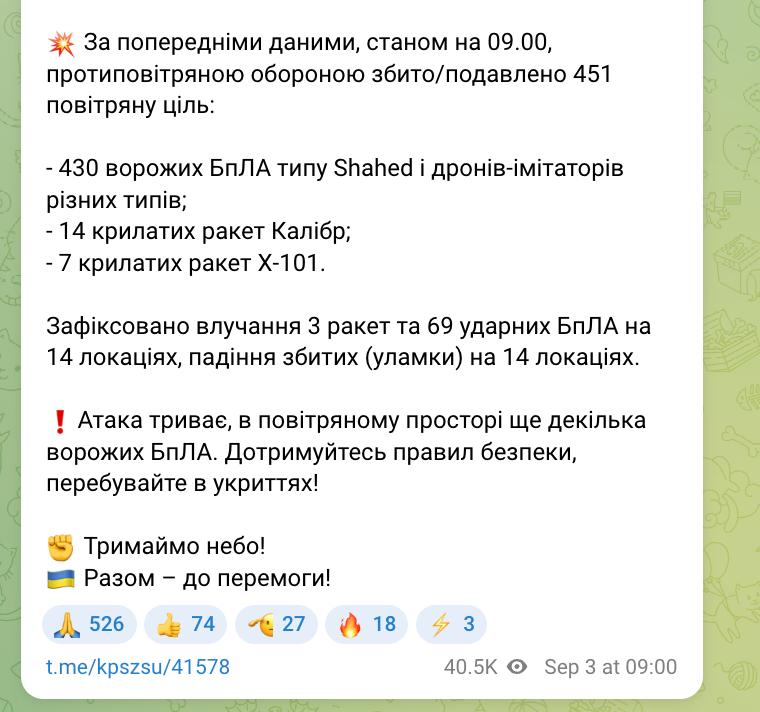 У Повітряних силах ЗСУ повідомили, що Україну вночі атакували 502 БПЛА та 24 крилаті ракети, було 72 прильоти. Збити вдалося 451 дрон ("Шахеди" та імітатори) та 21 ракету.