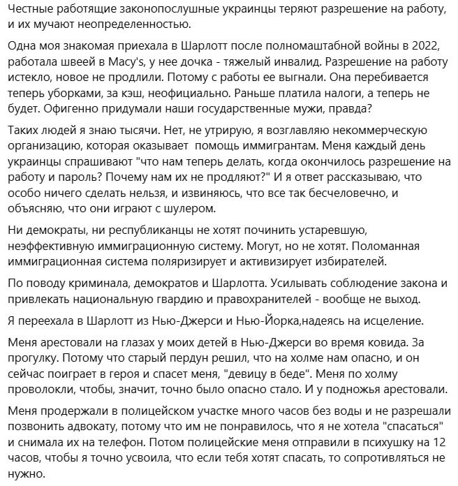 "І те, й інше зараз для українців у США і підвисло, на паузі. Українцям ці статуси не продовжують, але й не скасовують. Українці дисципліновано платять держмита, подаються на продовження статусів, чекають – а імміграційна служба робить вигляд, що їх не існує і нічого не було. мучать невизначеністю. Одна моя знайома приїхала в Шарлотт після повномасштабної війни в 2022 році, у неї дочка - важкий інвалід. Офігенно вигадали наші державні мужі, правда? Таких людей я знаю тисячі», – написала Панова у Фейсбуці.