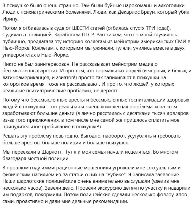 "Мене заарештували на очах у моїх дітей у Нью-Джерсі під час ковіда. За прогулянку. Тому що старий пердун вирішив, що на пагорбі нам небезпечно, і він зараз пограє в героя і врятує мене, "дівчину в біді"... Мене протримали в поліцейській дільниці багато годин без води і не дозволяли тому подзвонити "Рятуватись" і знімала їх на телефон. Потім поліцейські мене відправили в психлікарню на 12 годин, щоб я точно засвоїла, то чинити опір не треба. У психлікарні було дуже страшно. Безглузді госпіталізації здорових людей в психлікарні - це реальна і дуже комплесна проблема, і на цьому заробляють великі гроші (я особисто розлучилася з десятками тисяч доларів через ту пригоду, в тому числі мені самій довелося оплатити моє примусове перебування в психлікарні!) більше психлікарень", - написала Панова.