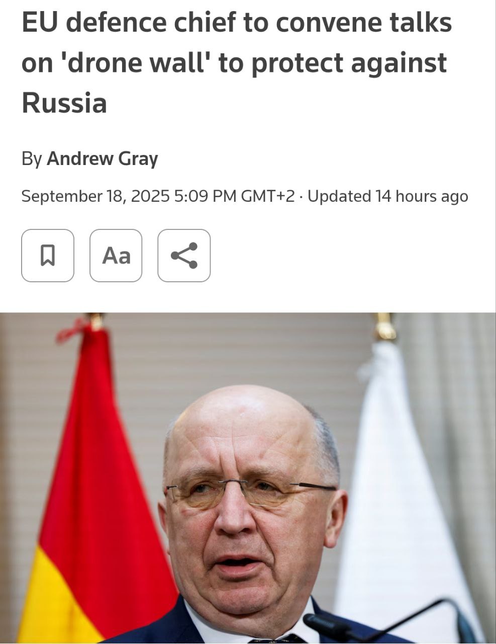 Агентство наводить заяву єврокомісара з питань оборони Андрюса Кубілюса про те, що обговорення стіни дронів поки що знаходяться на початковій стадії. За його словами, у Брюсселі проект представляють як поєднання засобів виявлення, поразки і систем глушення для нейтралізації безпілотників, що наближаються.