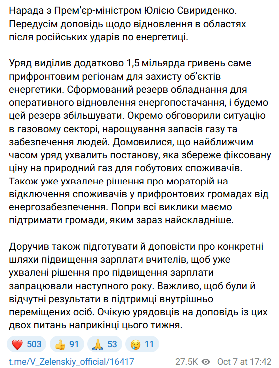 "Уряд виділив додатково 1,5 мільярда гривень саме прифронтовим регіонам для захисту об'єктів енергетики. Сформовано резерв обладнання для оперативного відновлення енергопостачання і будемо цей резерв збільшувати. Домовилися, що найближчим часом уряд прийме постанову, що зберегла фіксовану ціну на природний газ для побутових споживачів. Також вже ухвалено рішення про мораторій на відключення споживачів у прифронтових громадах від енергозабезпечення", - повідомляє президент.