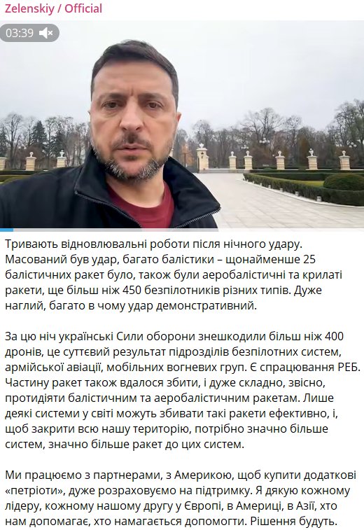 "Масований був удар, багато балістики - не менше 25 балістичних ракет було, також були аеробалістичні та крилаті ракети, ще понад 450 безпілотників різних типів", - заявив глава держави.