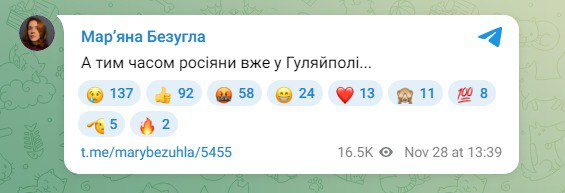Нагадаємо, напередодні президент РФ Володимир Путін повідомив, що російська армія підійшла на 1,5-2 км до Гуляйполя і "піде далі".