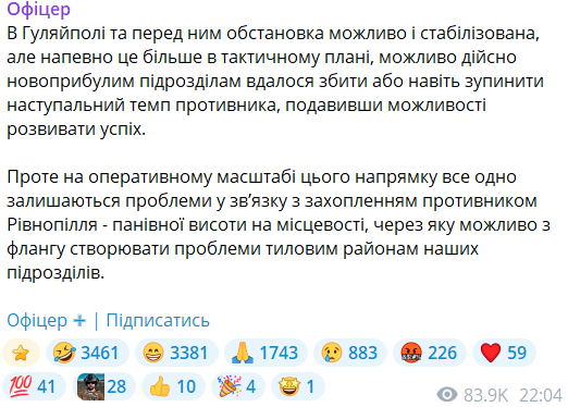 "У Гуляйполі і перед ним обстановка, можливо, і стабілізована, але напевно це більше в тактичному плані, можливо, справді новоприбулим підрозділам вдалося збити або навіть зупинити наступальний темп противника, придушивши можливості розвивати успіх. Однак на оперативному масштабі цього напряму все одно залишаються проблеми у зв'язку із захопленням противником з Рівного - створювати проблеми тиловим районам наших підрозділів", – написав військовий.