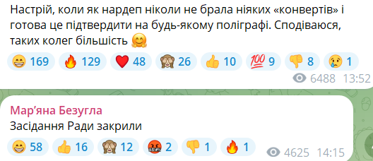 Народний депутат від "Слуги народу" Мар'яна Безугла у свою чергу повідомила, що на тлі слідчих дій, які НАБУ проводить щодо нардепів, засідання Верховної Ради було закрите.