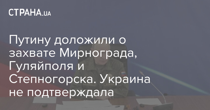 Командування російської армії доповіло президенту РФ Володимиру Путіну про захоплення трьох населених пунктів України. Йдеться про міста Мирноград Донецької області, Гуляйполе і Степногірськ Запорізької області.