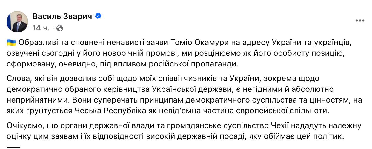 На слова спікера відреагував у Фейсбуці посол України у Чехії Василь Зварич.За словами дипломата, "образливі та сповнені ненависті" заяви Окамури на адресу України сформовані "під впливом російської пропаганди".Він назвав "негідними та неприйнятними" заяви спікера.
