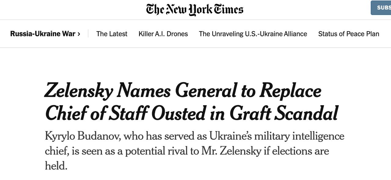 "У пана Буданова міцні зв'язки зі Сполученими Штатами, що може відіграти важливу роль у мирних переговорах України з адміністрацією Трампа. Він пройшов підготовку в рамках програми, що підтримується ЦРУ, і після поранення в боях на сході України проходив лікування в Національному військово-медичному центрі імені Уолтера Ріда в Меріленді," NYT.
