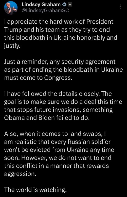 "Коли йдеться про територіальні обміни, я реаліст і розумію, що кожного російського солдата не вдасться виставити з території України найближчим часом. Однак ми не хочемо завершувати цей конфлікт таким чином, що винагороджує агресію", - написав Грем.