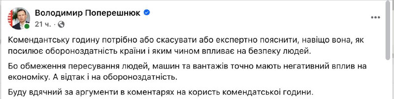 "Комендантську годину потрібно або скасувати, або експертно пояснити, навіщо вона потрібна, як посилює обороноздатність країни і яким чином впливає на безпеку людей. Тому що обмеження пересування людей, машин і вантажів точно негативно впливає на економіку. А отже, і на обороноздатність", - написав Поперешнюк.