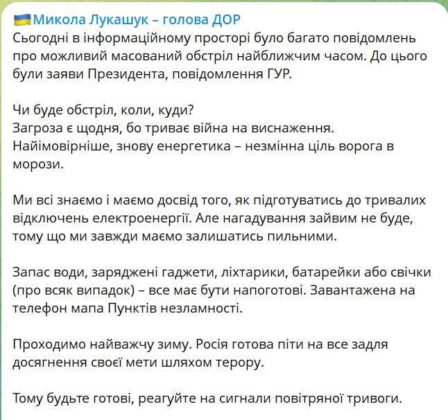 Крім того, про загрозу масованого російського удару найближчими днями також пише у своєму телеграм-каналі голова Дніпропетровської обласної ради Микола Лукашук.