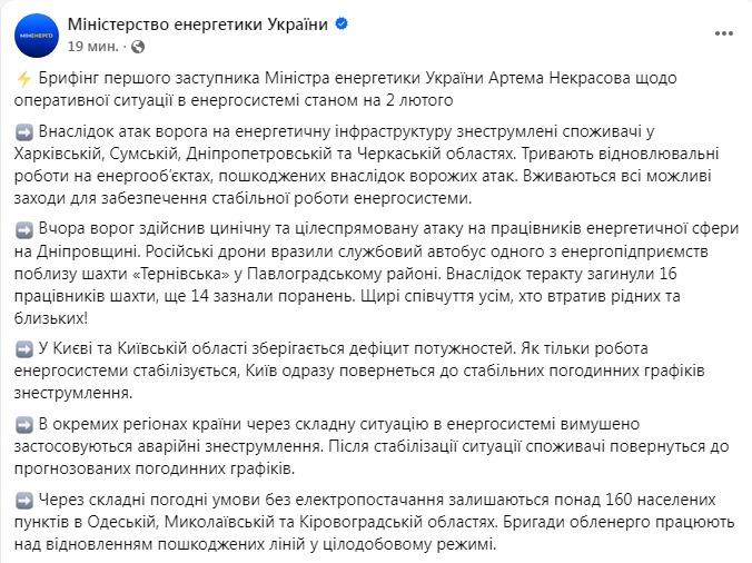 Також чиновник навів подробиці вчорашнього удару по службовому автобусу із шахтарями. За його словами, дрони атакували транспорт одного з енергопідприємств поблизу шахти "Тернівська" у Павлоградському районі Дніпропетровської області. Внаслідок цього загинули 16 працівників шахти, ще 14 отримали поранення.
