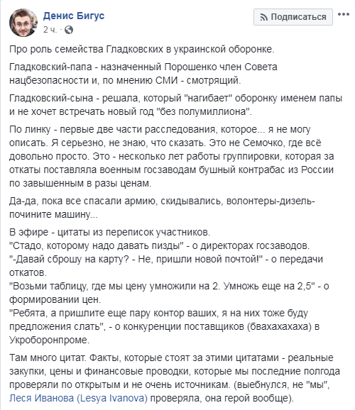 На Фейсбук-странице журналиста Дениса Бигуса появилась часть подробностей из видео про роль семейства Гладковских в украинской оборонке: