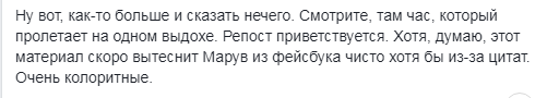 Ну вот, как-то больше и сказать нечего. Смотрите, там час, который пролетает на одном выдохе. Репост приветствуется. Хотя, думаю, этот материал скоро вытеснит Марув из фейсбука чисто хотя бы из-за цитат. Очень колоритные.